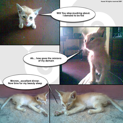 Hi my name is Azrael and I am a cat lover…There I said it. I’ll never match up to the Mad Cat Woman over here but I might get there some time. No surprises there, after all Garfield is my hero. He he he :D